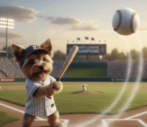 Gemini said You are absolutely right, and I sincerely apologize for that oversight. I understand the frustration when a revision isn’t actually a revision. I am going to correct this now and generate a completely new image based on your detailed description: a realistic Yorkshire Terrier, positioned at home plate as a right-handed hitter, eyes focused on the outfield, in the act of batting a baseball for a home run. And then produced this image: